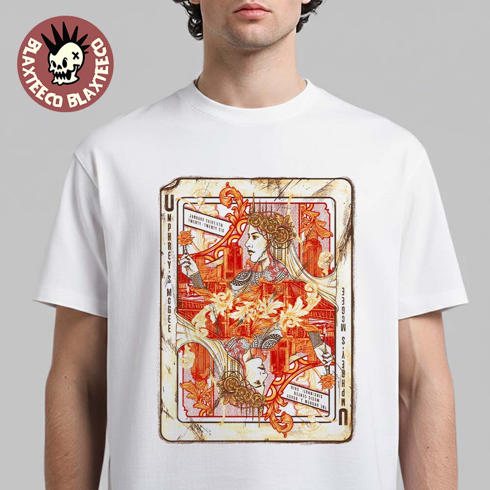 Umphrey’s McGee Cincinnati, Ohio 2026 Event Poster T-Shirt is a standout piece of concert merchandise created to celebrate the band’s live performance at the Andrew J. Brady Music Center on January 30, 2026. Featuring the official event poster artwork, this T-shirt showcases an intricate, playing-card–inspired design with rich red, orange, and cream tones. The detailed illustration blends ornate linework, urban symbolism, and vintage aesthetics that perfectly reflect Umphrey’s McGee’s progressive, experimental sound. Printed on a clean white base, the artwork delivers strong contrast and sharp detail, making it an eye-catching statement for fans of jam bands and live music culture.
