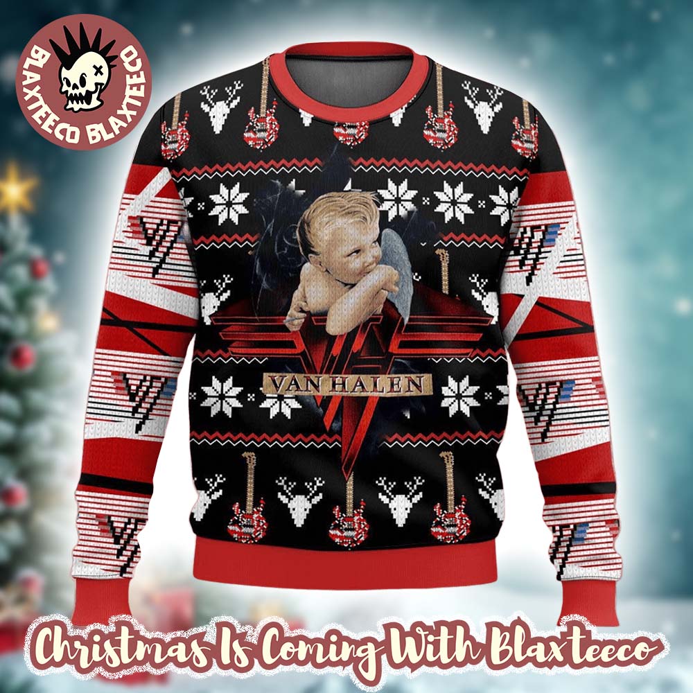 Blaxteeco: About Van Halen 1984 Baby Angel Album Cover Art With Signature Guitar Pattern Knitted Ugly Christmas Sweater: