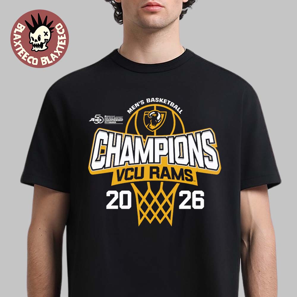 The shirt features bold “Champions – VCU Rams 2026” lettering across the front, paired with a basketball hoop graphic and the iconic ram logo. The black-and-gold color scheme reflects the proud identity of the VCU Rams and celebrates their success within the competitive Atlantic 10 Conference.