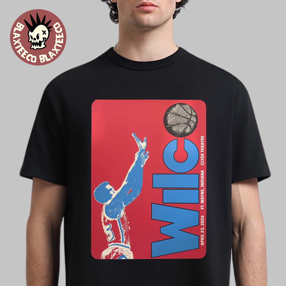 The Wilco Ft Wayne Indiana 2026 Venue Poster At Clyde Theatre On April 23 2026 T-Shirt is a bold and artistic tribute to the band’s live performance on April 23, 2026, making it a must-have for fans and collectors alike. Featuring a striking poster-style graphic on the front, the design showcases a dynamic basketball-inspired illustration paired with strong red and blue tones, creating a retro yet modern visual impact. The vertical “Wilco” typography adds a unique layout that mirrors vintage concert posters, while the inclusion of “Ft. Wayne, Indiana – Clyde Theatre” and the event date makes this piece a memorable keepsake from the show. It’s a perfect blend of music culture and eye-catching design that stands out in any wardrobe.