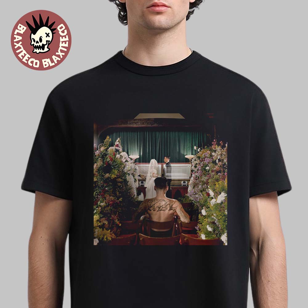 The shirt features a dramatic album-style image printed on the chest, depicting a cinematic chapel scene surrounded by elaborate floral arrangements. A bride and groom stand at the altar before a casket while a tattooed figure sits in the pews watching—creating a powerful, symbolic composition that reflects the dark, atmospheric tone often present in Yeat’s music and visual style.
