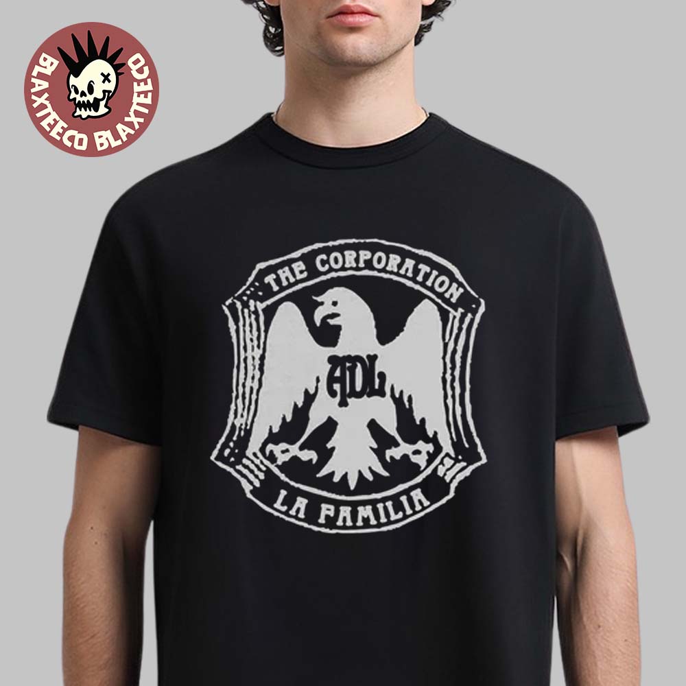 This tee features a powerful crest-style emblem printed on the front, designed with a fierce eagle at the center and the initials A.D.L. placed prominently on its chest. Surrounding the emblem are the phrases “The Corporation” and “La Familia,” giving the design a strong, symbolic identity that blends street culture, loyalty themes, and bold album-inspired branding.