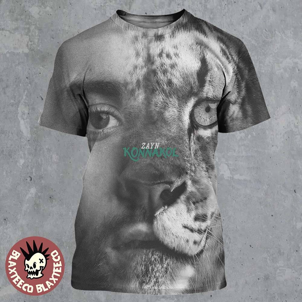 Zayn Konnakol Album Cover Art All Over Print Shirt is a bold statement piece designed for fans who appreciate powerful music visuals and standout streetwear. Inspired by the iconic Konnakol album artwork, this all-over print shirt features a striking black-and-white fusion of human and animal imagery, symbolizing strength, duality, and raw emotion. The high-resolution print covers the entire shirt seamlessly, creating an immersive design that instantly grabs attention. With the subtle “Zayn Konnakol” text centered on the chest, this shirt balances artistic depth with modern minimal branding, making it perfect for fans of Zayn Malik, contemporary pop, and conceptual album art fashion.